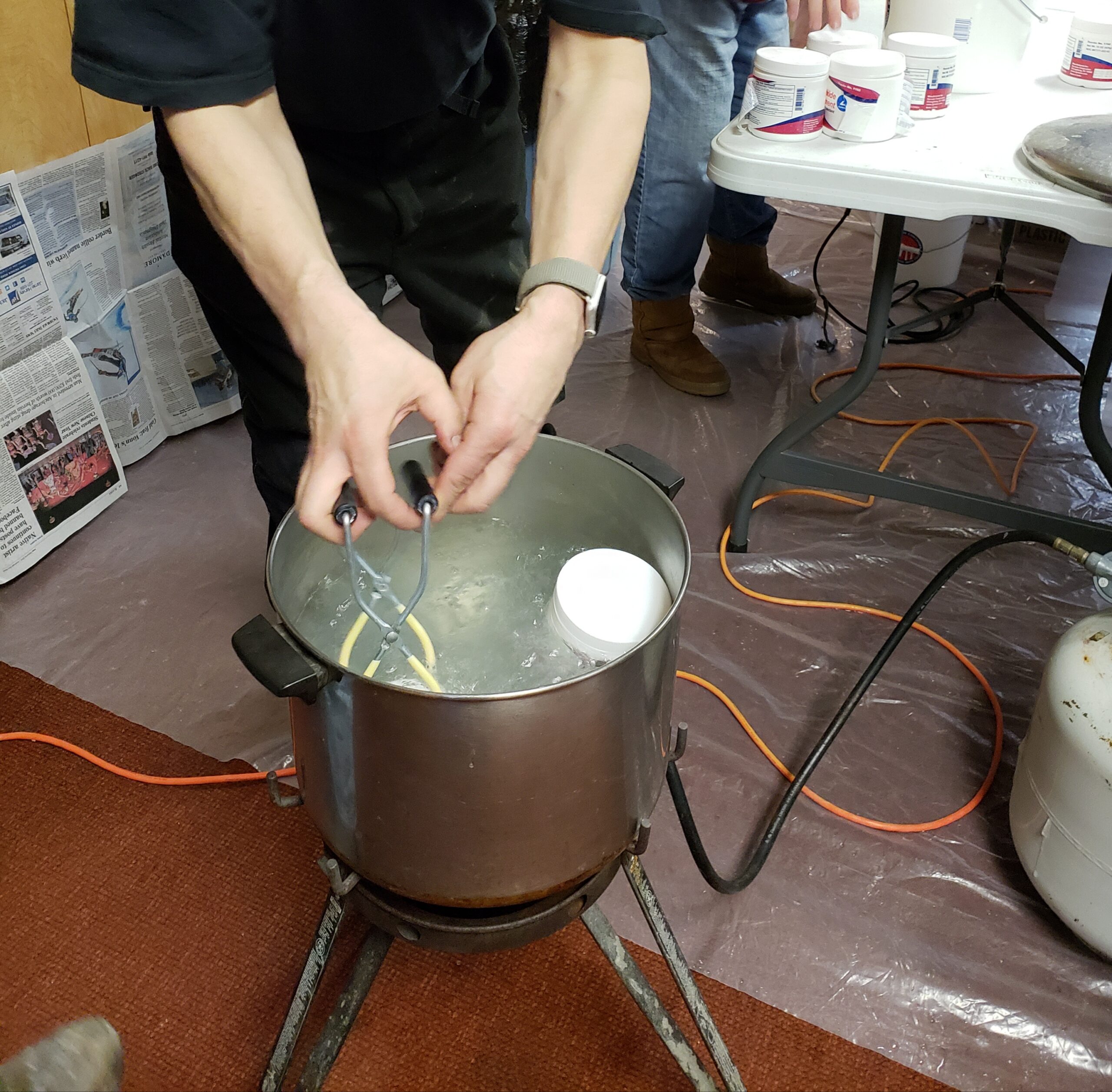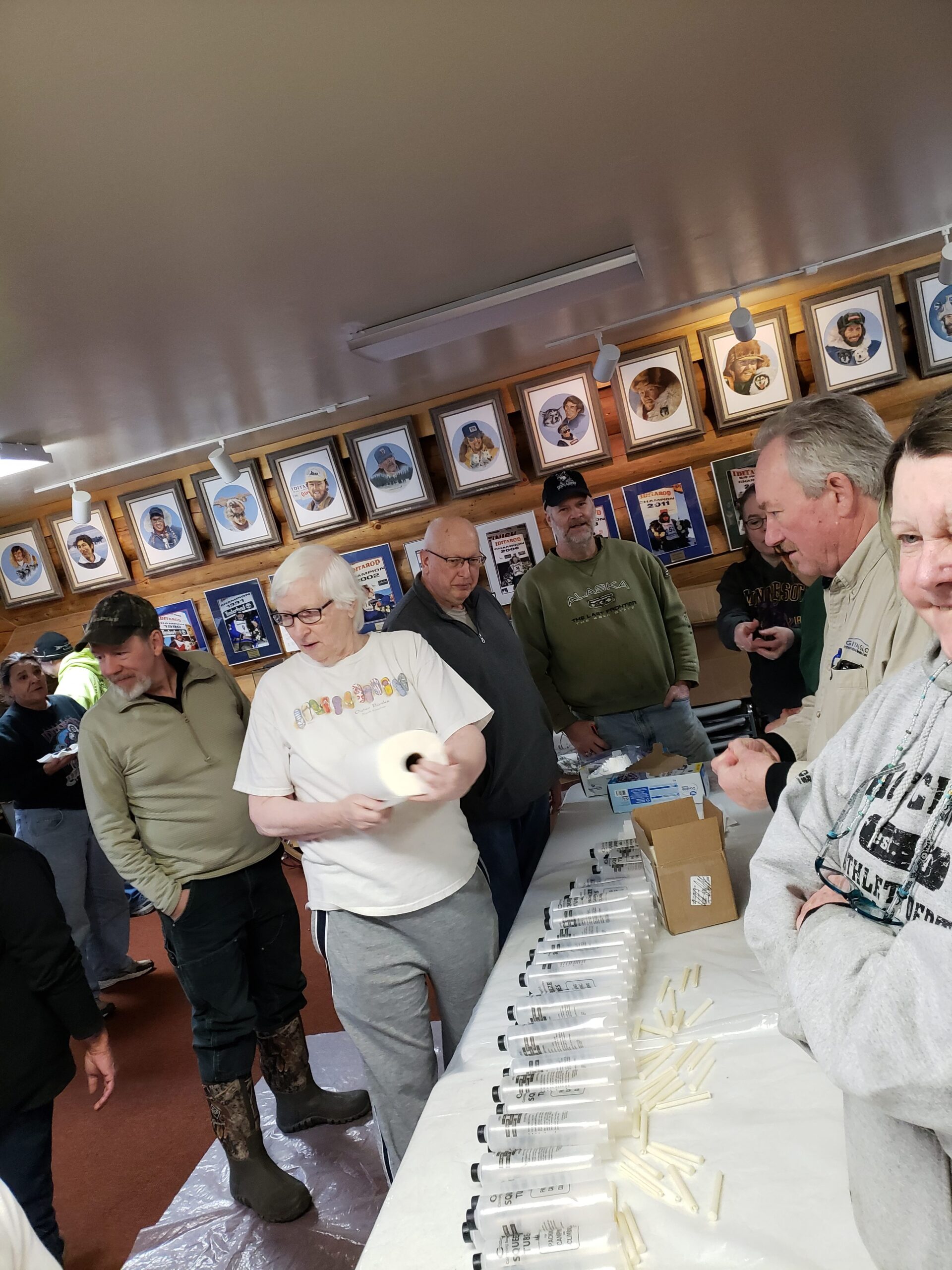 On Saturday, February 16, another group assembled at Iditarod headquarters in Wasilla to prepare the foot ointment used on the four-footed athletes. As with other race practices, this is an example of dedication to top-notch dog care. A simple mixture of 5 parts of zinc oxide to 1 part triamcinolone acetonide cream mixed with mineral oil, the ointment is given to each musher at the pre-race meeting and is also sent out on the trail to the checkpoints for the vets and mushers.