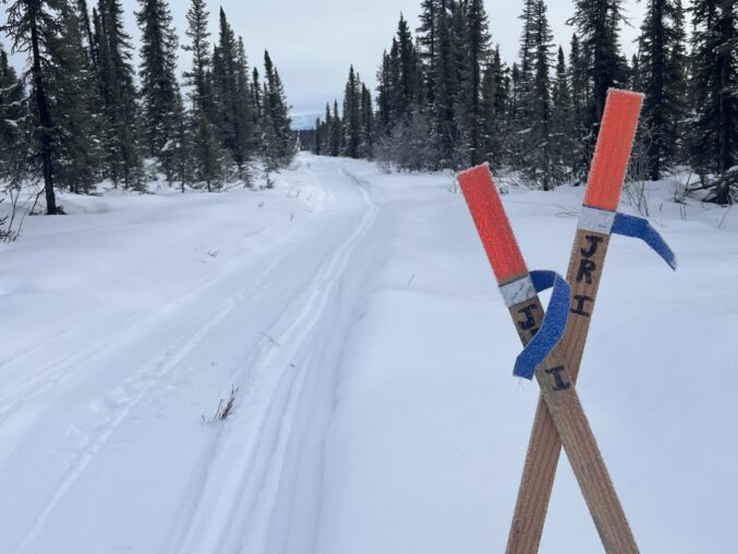 PUPDATES _ The race this year was moved to Tolsona Lake due to a lack of snow in the Wasilla area. Once I arrived at the race start, I helped place tracking devices on the musher’s sleds. The tracker first gets placed inside a dog bootie, then attached to the front of the dog sled. Shortly before the race started, I was told that I was going to ride out on a snow machine with the trail breakers ahead of the teams. The purpose of the trail breakers is to make sure that the trail is safe for the mushers. They were making sure that the trail was properly marked (trail markers are placed differently at times to alert mushers of the trail ahead or which direction to go) and that there weren’t any obstacles in the trail.