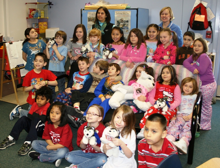 After two days of ferocious (one of my favorite words) wind, it died down in the Anchorage area. My day started with a couple of Skype calls to East Coast schools, followed by presentations to Chinook Elementary and Willow Crest Elementary. These capped 11 or 12 presentations I’ve given since arriving in Alaska, sometimes to a couple of classes in a grade level, and sometimes to 200 students at once. Willow Crest celebrated Dr. Seuss’s birthday today. The author would have been 107 years old. Mr. Bryan Bearss, a kindergarten teacher at this school and an Iditarod race veteran, invited me to speak to the school. The teachers wore Cat in the Hat hats, and students dressed as book characters. I remember seeing one girl dressed as Thing Two.