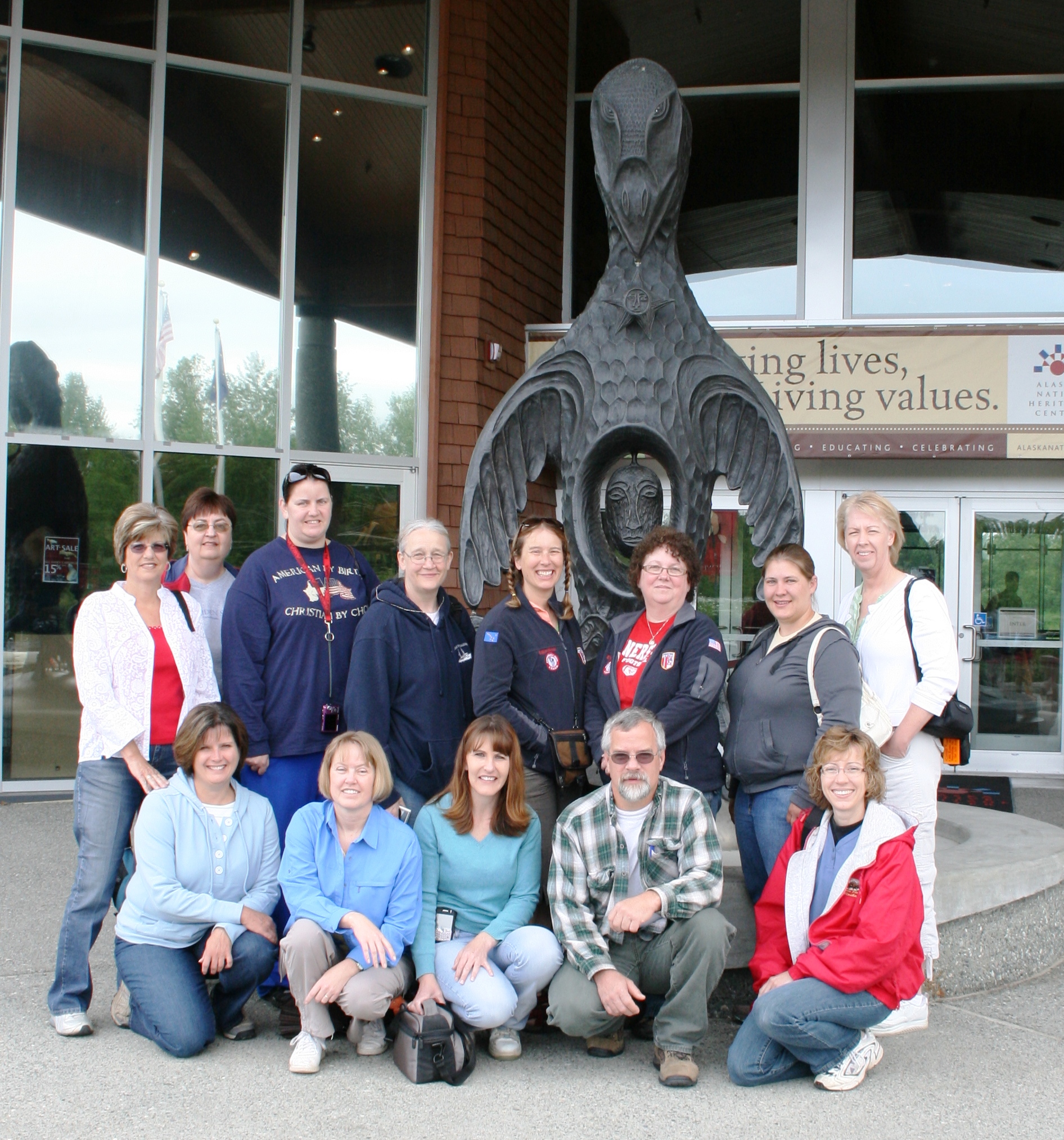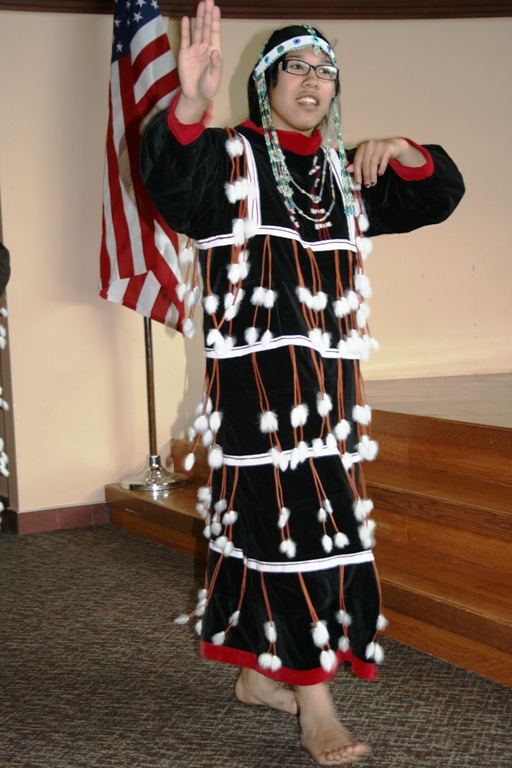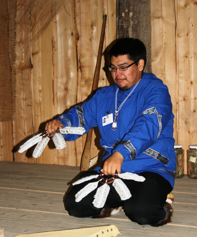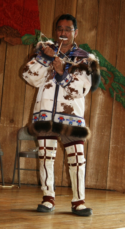 At the Native Alaska Heritage Center in Anchorage, Native Alaskans told us about these four groups, demonstrated native games of skill, told a story of a grandfather and growing up, and performed dances in Aleut regalia. I didn’t move for an hour and a half except to lift the camera to shoot pictures. An outdoor walking trail provides the oppportunity to see and go inside replicas of living spaces of the various cultures. Craftsmen carve totem poles, sew fur parkas (or parkys, as it may be pronounced), and explain the daily household items of the cultures.