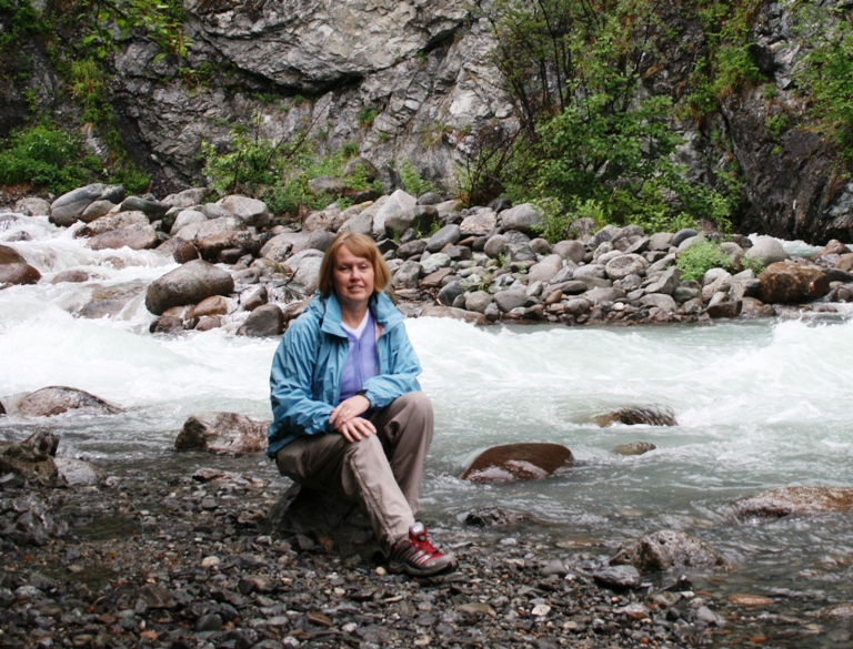 Before going to the musher picnic and signup for the 2011 race, I had the chance to go on the Hatcher Pass road. This road leads to the Independence Gold Mine which is closed, but you can visit it. The day was overcast and we ended up driving through the clouds, but it was beautiful. The Little Susitna river is glacier fed, so the water has a green/blue cast to it.