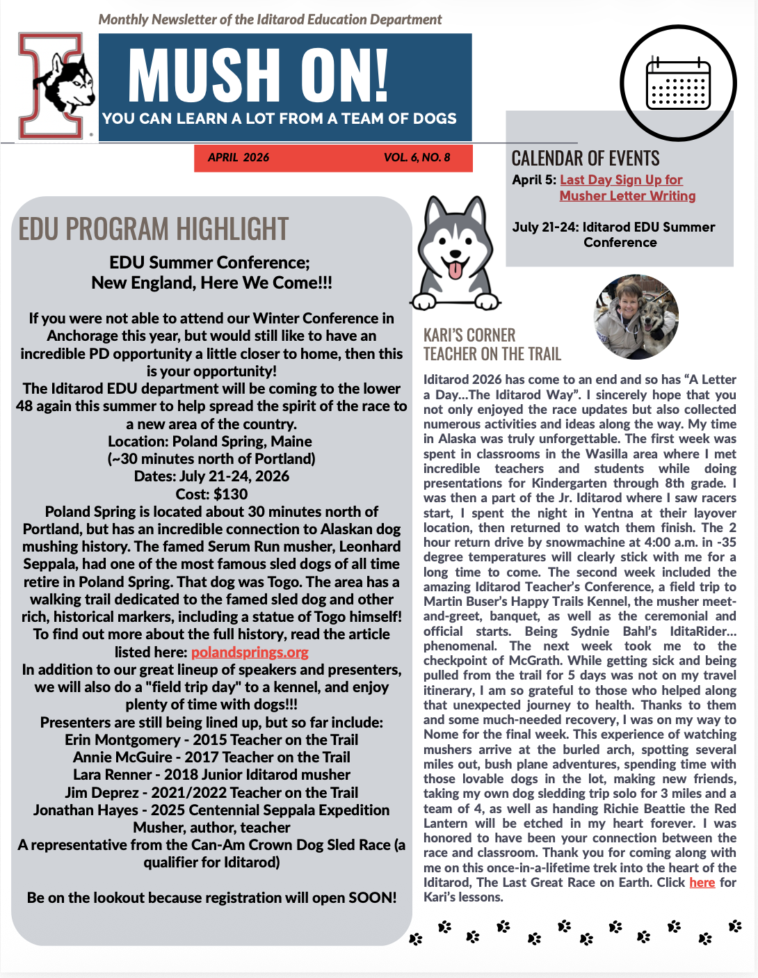 Our monthly Iditarod EDU newsletter, Mush On!, will bring you new ideas, reintroduce familiar standbys, and will be helpful whether you are a rookie or a veteran Iditarod educator!