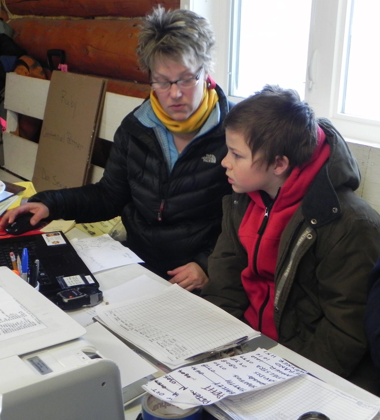always interested in what she was doing. In this picture she is explaining to this young man how mushers are tracked and how you calculate “out” times after an eight hour rest.
