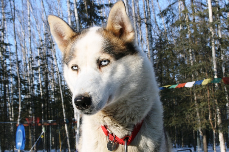 This afternoon the teacher conference visited Jon and Jona Van Zyle’s home and kennel of well-behaved Siberian huskies. Both of them are talented artists, and Jon creates the official Iditarod poster each year for the race. The dogs played in the dog yard with us, exercised on their exercise wheel, which they jump on and off as they wish, ate at their “buffet” table, and gobbled down fish snacks.