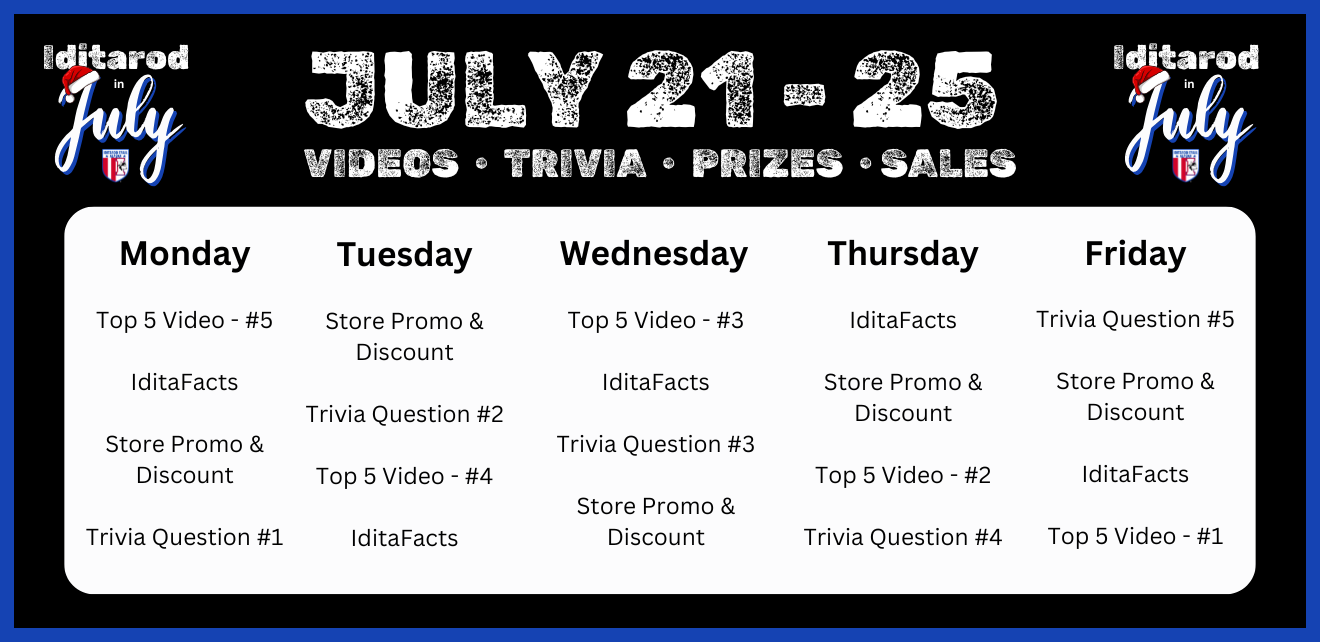 We are pleased to announce the 5th annual Iditarod in July, where each day for the next 5 days we will be spreading a little bit of Iditarod magic with a daily release of the top 5 videos from 2025, daily trivia questions where one winner will walk away with Iditarod swag, daily Iditarod store discounts and more fun all week long!