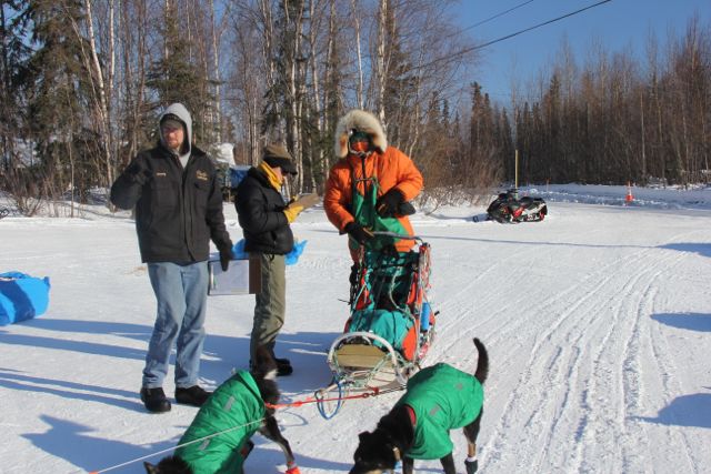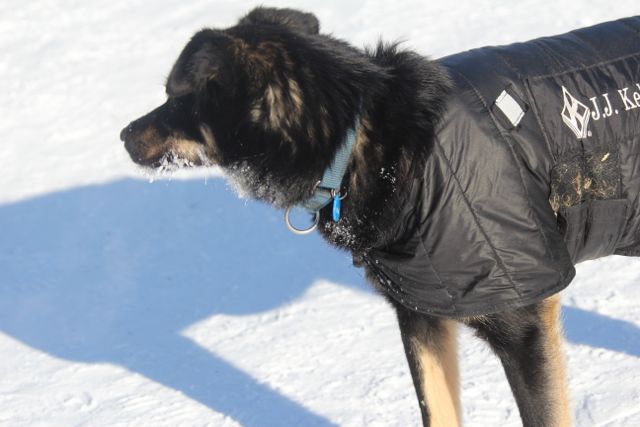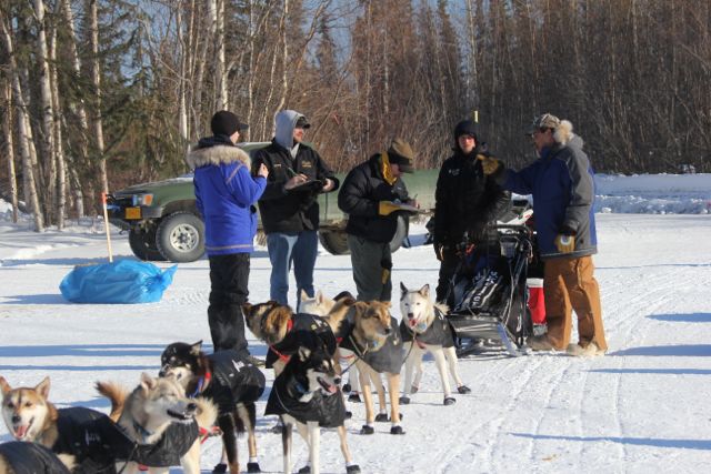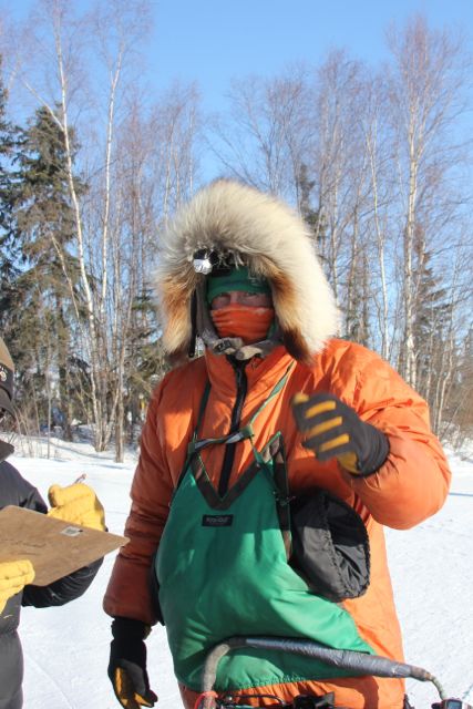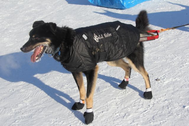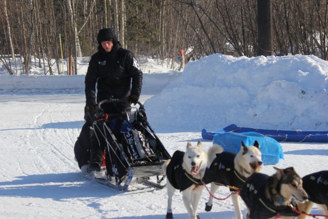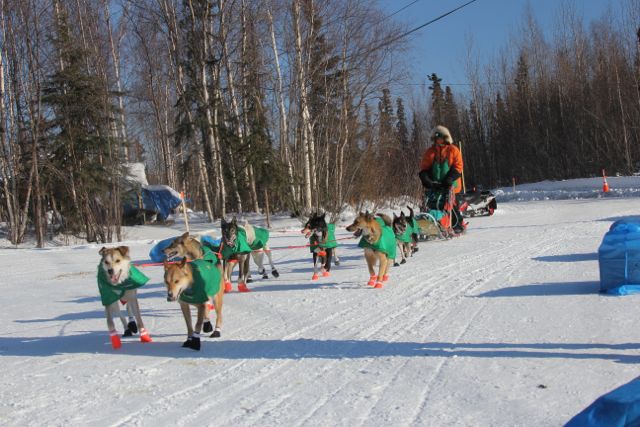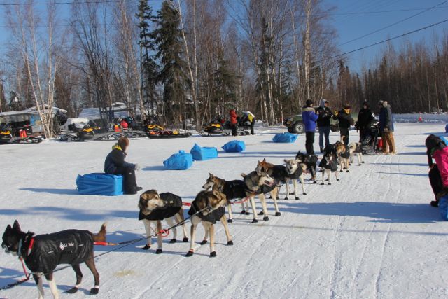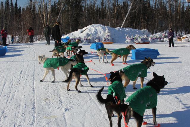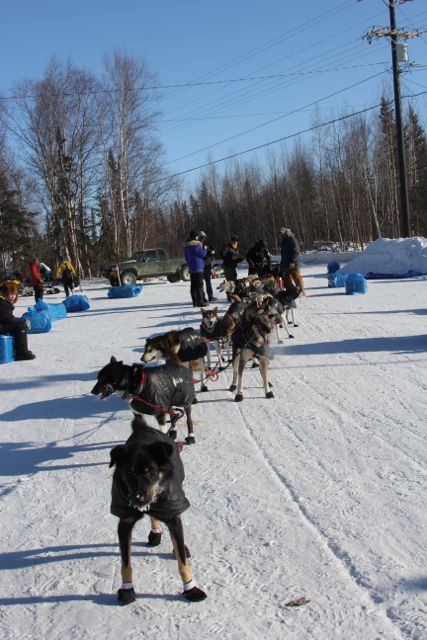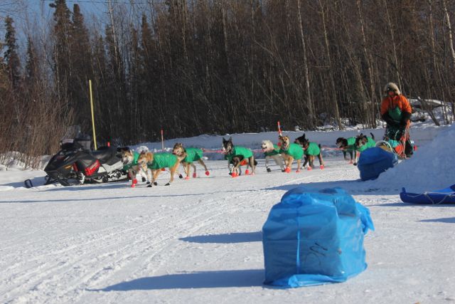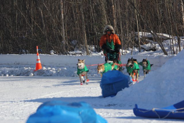 The Yukon River is showing its nicest side. Right when I was about to leave Galena, first Dallas Seavey then Kelly Maixner both pulled in. I did not have much of a chance to talk to them. Both teams looked great. Kelly is another of those guys driving with no necklines. As soon as he stops the dogs are all over the place. They look like a fan hitch. Personally it would drive me nuts to look at my team like that, but Kelly is one of the many people doing this system. And Kelly is one of the many people driving a nice-looking, large string. So despite the aesthetics, the advantages for the dogs are undeniable. Maybe something to try for the summer.