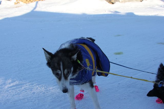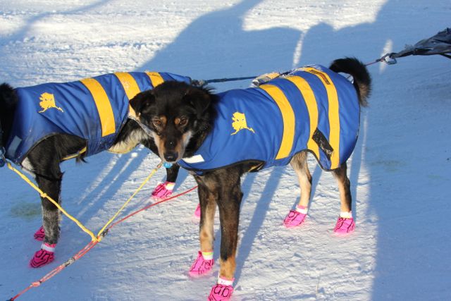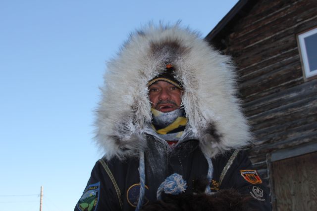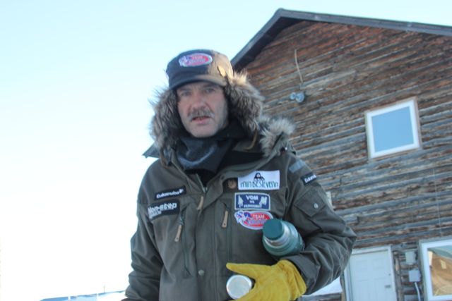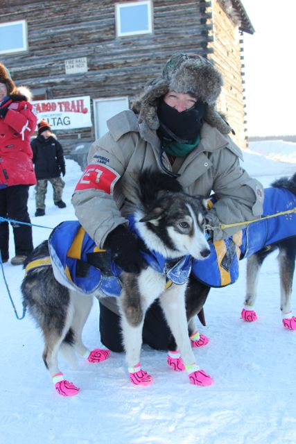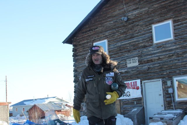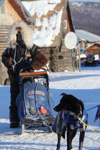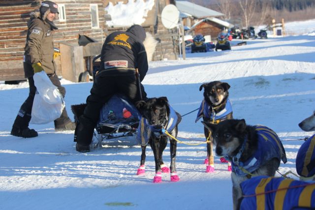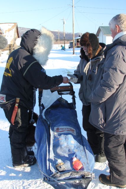 Once again I was a bit too slow to see Hugh Neff coming off the river. He was repacking his sled right in front of the checkpoint. His team is only 8 dogs strong. They look good with nice weight on them. Driving a smaller team does not leave much room for error, yet it has the advantage of less dogs to worry about and dog chores being done much quicker. Hugh drove 8 dog for much of the last half of the Yukon Quest. He is comfortable driving a small team, yet still competing, which this move through Kaltag shows. While Hugh was packing, Robert Sorlie delivered his return bag to the checkpoint. With 15 dogs on the gangline, Robert has almost double of Hugh’s dog power, but also a lot more work to take care of his large team.