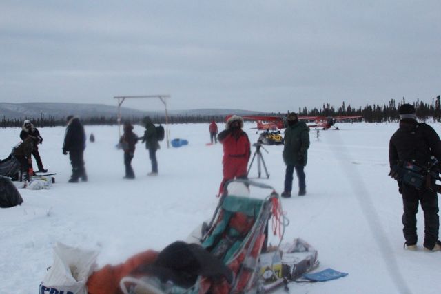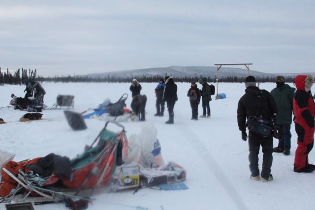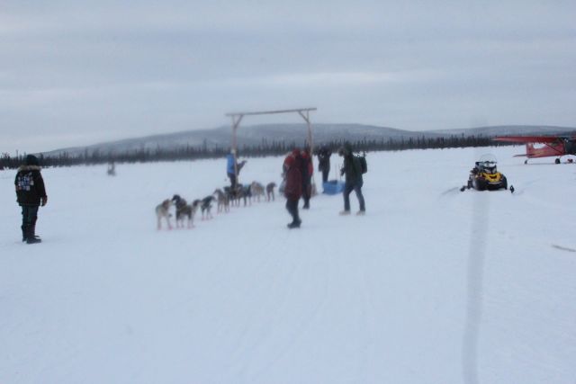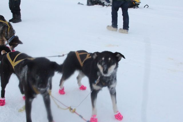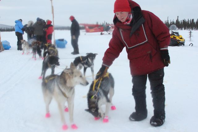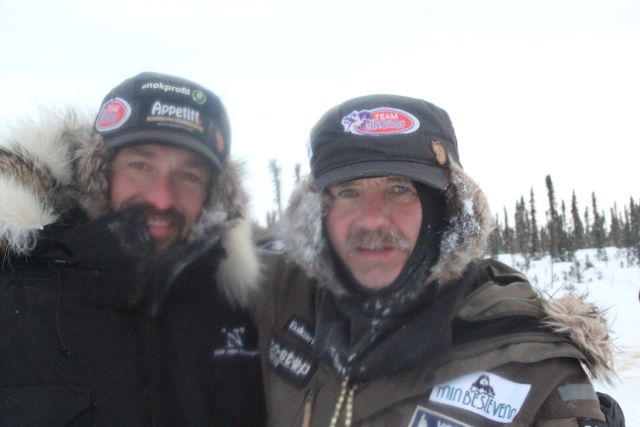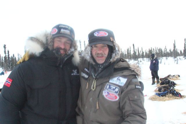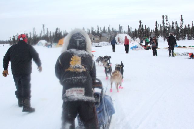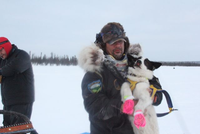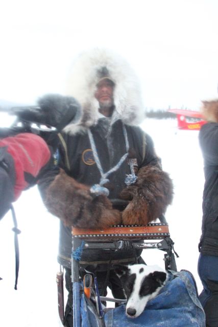 Next team into Cripple is Hugh Neff. After checking in, his usual “ Alllllrighhht “ sounded across the dog yard. He chose the short term parking as the others ahead of him had done so.The teams who take their 24 hr layover are parked further up in the trees, to have a bit more quiet and also out of the wind. It’s dead calm right now, so good parking for all teams. Hugh had one of his dogs in the bag.
