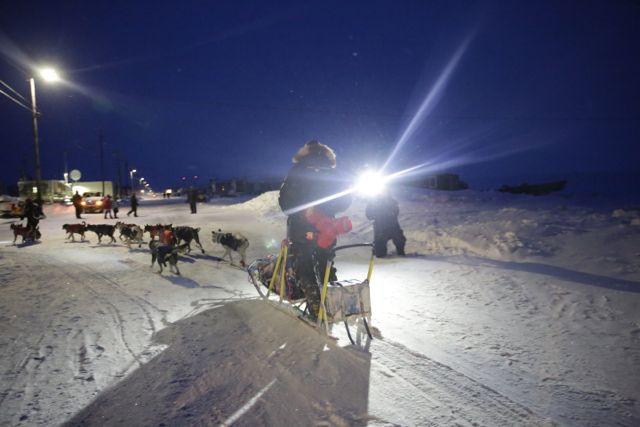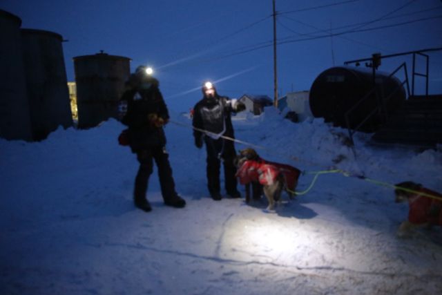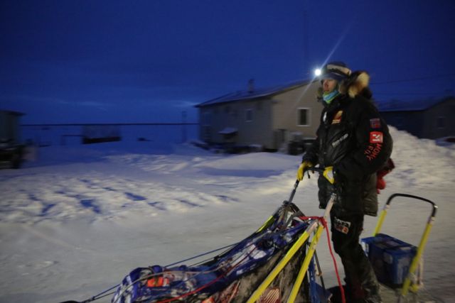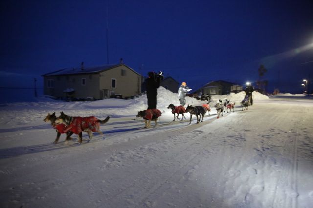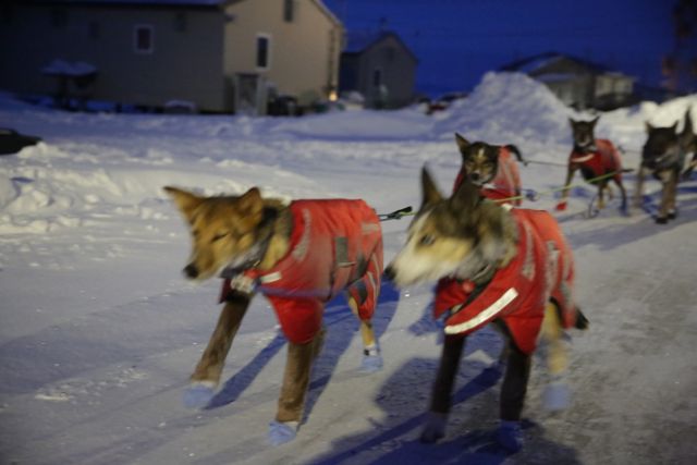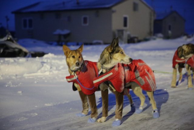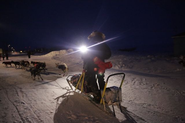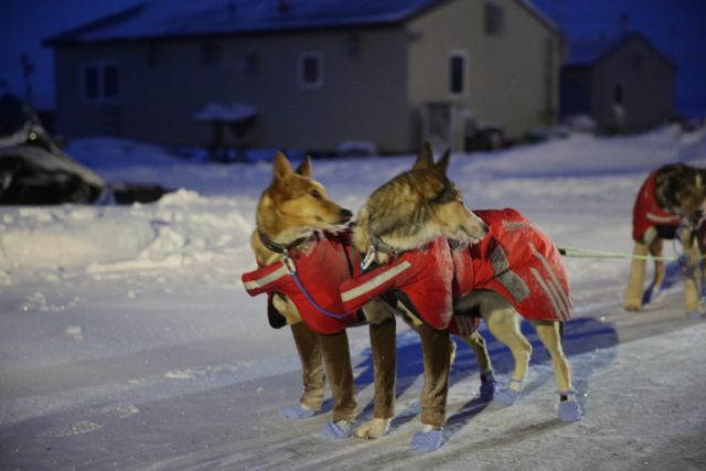 He decided to give them some rest and pulled up next to Mitch Seavey’s team in the dog lot behind the checkpoint building. It is a good place to rest, right out of the wind. It is not hardcore windy out, about 10 to 15 miles from the Northeast.