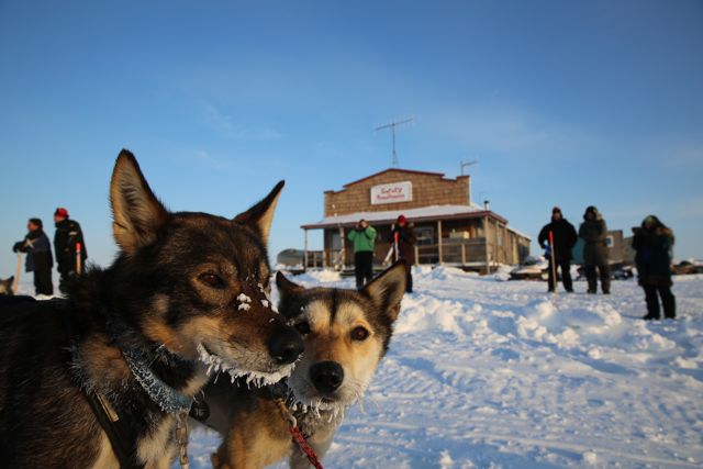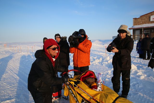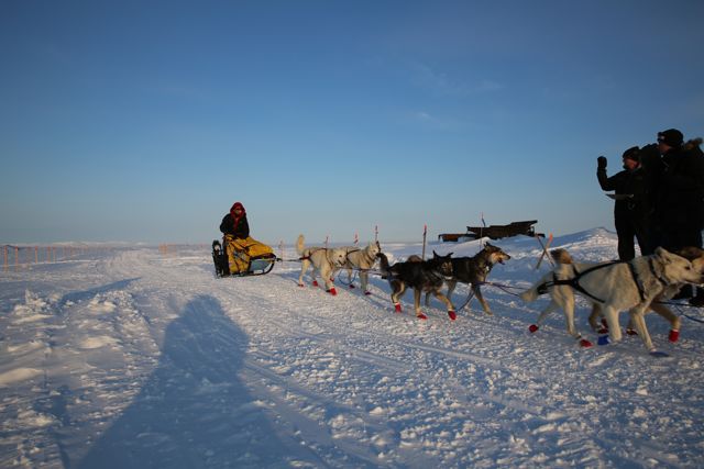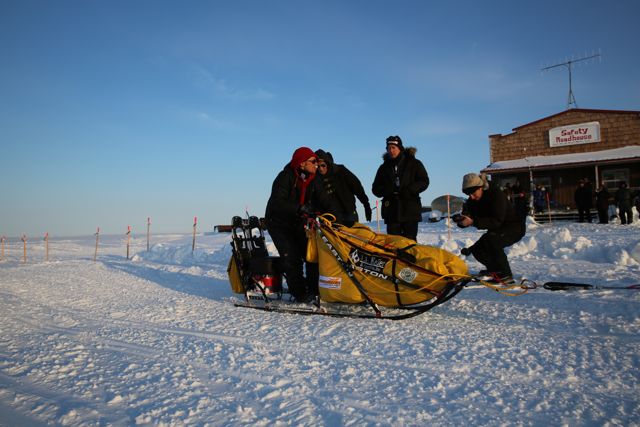 Mitch has left quite a while ago. Its quite here in Safety, much less people than expected. I heard snowmachiners here saying, that they rather want to go to NOme and not ride in the dark. Ha! They are going to miss a beautiful sunset riding on the Coast, and of course the beautiful sight of SP Kennels Red Team.