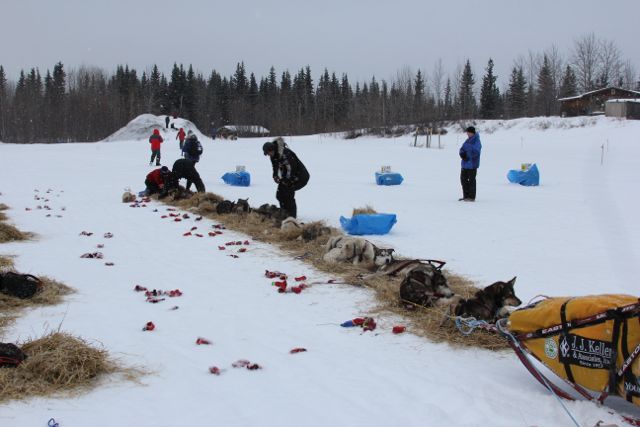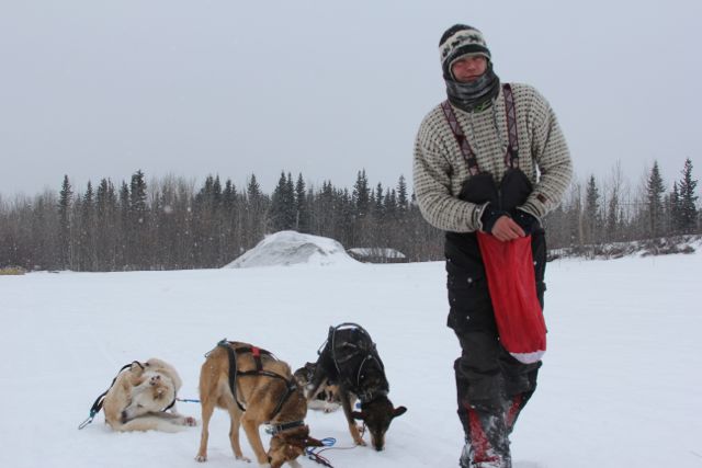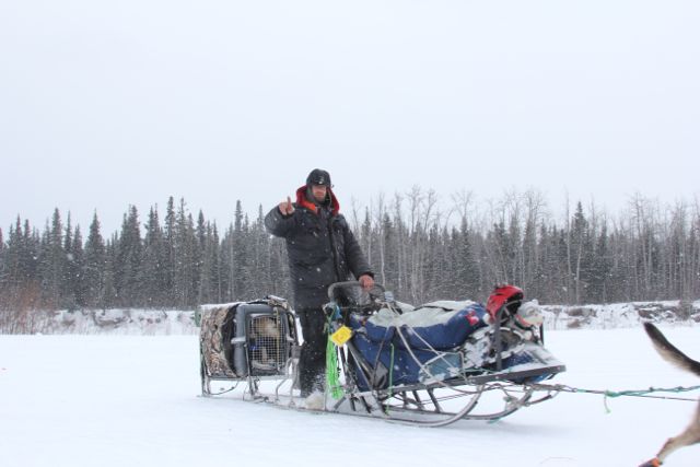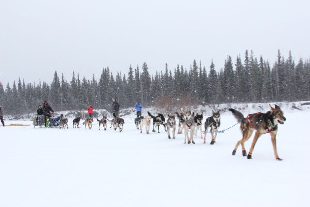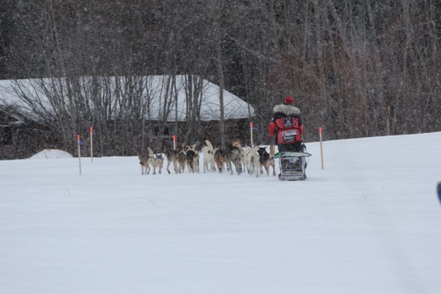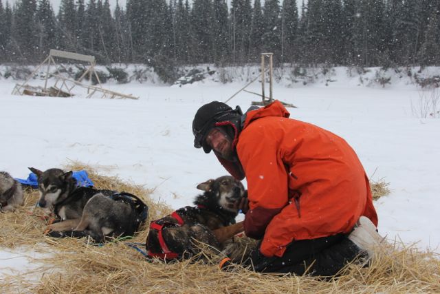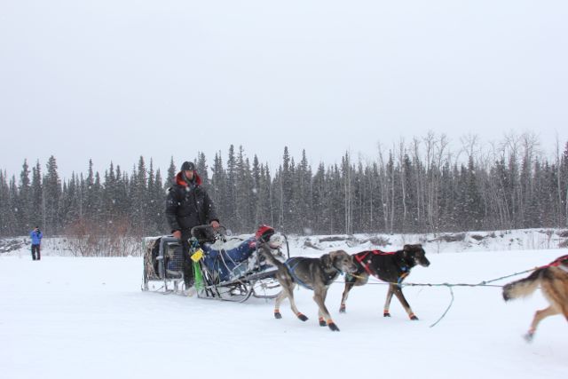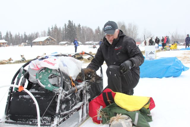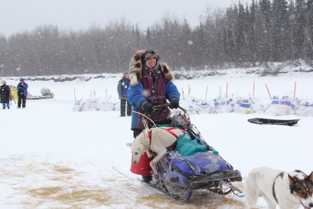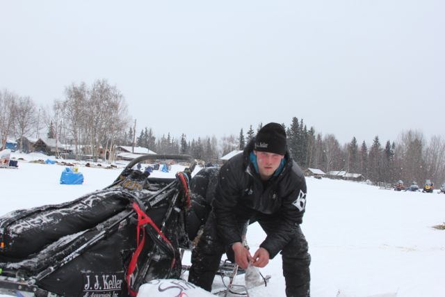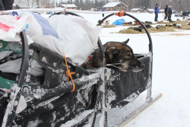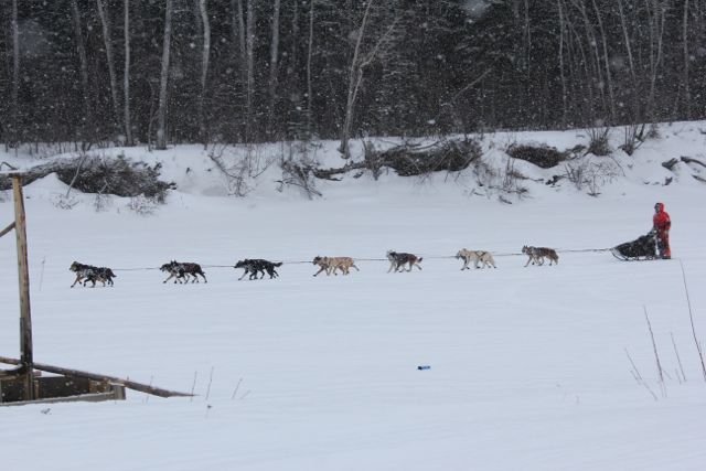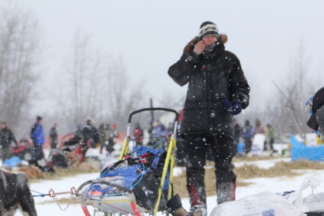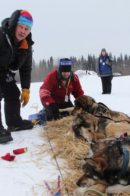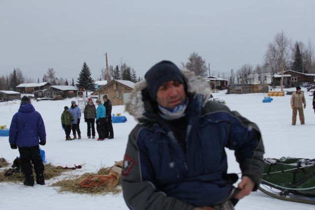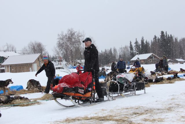 Nikolai is where the action is right now. While the first teams have hit the trail, Sonny Lindner leading the way with 16 nice looking dogs, other mushers are arriving in a steady stream. And some of them clearly show their war wounds like Hans Gatt who hit a tree. He is handling it with style, nothing a little rest can’t fix. Others like Joar Leifseth Ulsom, you have to look a little closer to see that an essential part of his sled is missing. ” I really have been out of control coming here ” he said. Without a break, it sure is no fun. His replacement sled is waiting in McGrath. Other mushers have sleds being hauled over from McGrath as we speak.