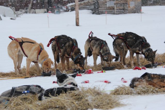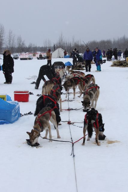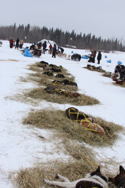 Joking with Mitch, I mentioned that he must have some German in his blood, as his team looked incredibly orderly, all dogs sleeping in a row and even eating in a row, as you can see in a picture below. His son was parked right behind him. Mitch said: ” I can shake him, well…. not yet “. It sure must be fun to have this as a family affair. Dallas is one of a kind, Very athletic. He said after hitting a tree his towline broke and left him with 2 dogs. He took off RUNNING after the 14 dogs on the loose. And he actually caught them. ON FOOT. Catching a running dog team. I am not sure this has been done much