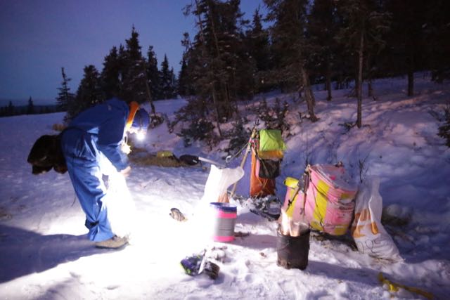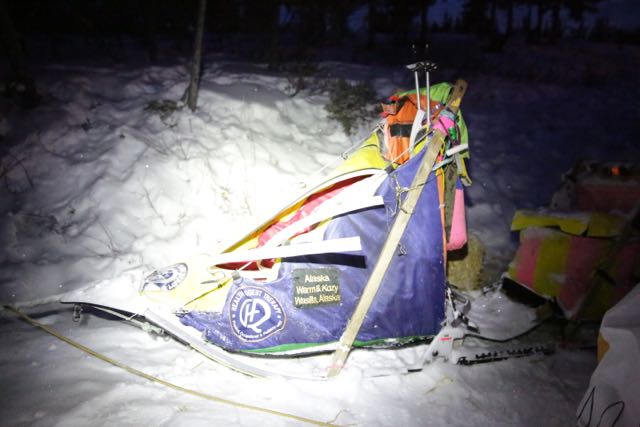 I had a nice chat with Wade this morning. I’m so happy for this kid. He is in a really nice position. Wade could sure use a payday too. He said his credit cards are all maxed out. He built his own sled and tied it together using surveyors string. It’s not the prettiest sled out here but it sure is doing the job. Wade has not been able to travel for training this year either. He has been stuck in Willow in all the warm rainy weather. But here he is in 8th place. He said he is going to try and catch Jeff King and pass him. I really like his attitude! Keep an eye out for this musher in the future!! (written by Tim Krause)