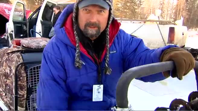 Iditarod Insider correspondent Bruce Lee shows off the high tech sled of musher Nicolas Petit.