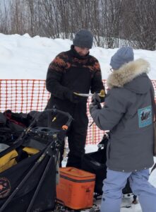 As you know, there are mandatory items that teams need to carry on the trail. Rule #16 gives a list of all mandatory items including sleeping bag, snowshoes, axe, etc. Also on that list is any promotional material provided by the ITC. First of all ITC stands for Iditarod Trail Committee, second of all, promotional material includes Trail Mail. If your family, class or school purchased Trail Mail, it is officially tucked into the team’s sled and is heading to Nome. Since it gets so wet in the sled, the mail has been securely bundled and vacuum sealed. Our Teacher on the Trail, Kari Wright, personally delivered the mail to each musher.