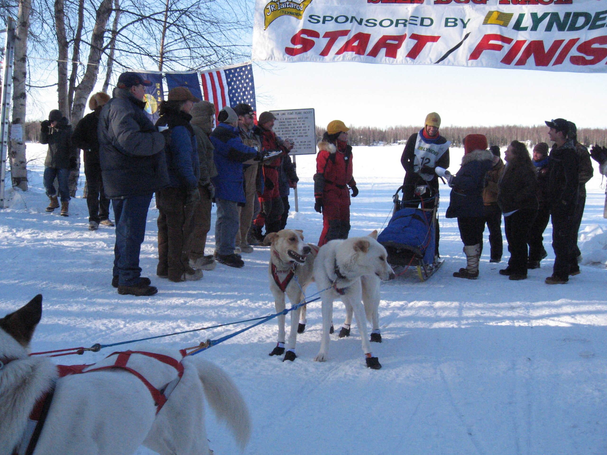 The mushers fed and bootied their dogs in the dark and departed Yentna long before there was light on the horizon. Not to warm, not to cold (-6 degrees) at Yentna Station Roadhouse on Sunday morning. The time is 03:31 and the first team leaves to cover the 75 miles course to the finish line in Willow. The timer/starter gives the team a 2-minute warning followed by 1 minute then 30 seconds and then the 5 second countdown to GO!